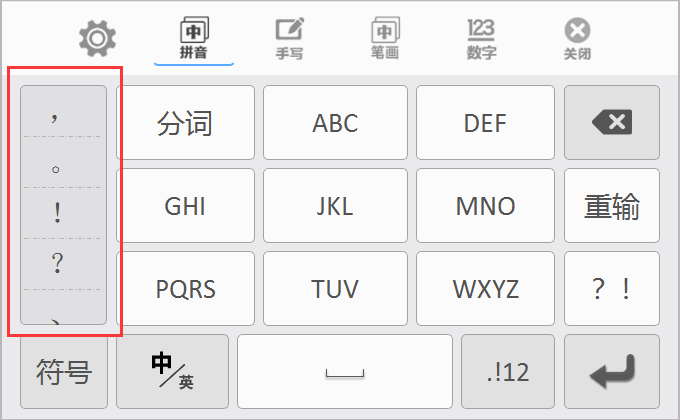 void DWIM_SetT9Symb(QObject * im, QString cn, QString en)设置九宫格模式下符号栏里的符号,如下图所示位置的符号。分为中文、英文符号。分别通过 cn 和 en 参数设置。